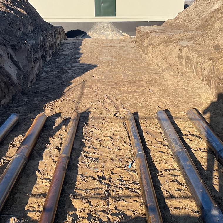 Wanneer ondergrondse kruisingen nodig zijn – bijvoorbeeld onder wegen, spoorlijnen of watergangen – passen we staalpersingen toe. Met deze techniek persen we stalen mantelbuisconstructies nauwkeurig en zonder open ontgraving in de grond. Zo zorgen we voor een veilige, efficiënte en duurzame oplossing, met minimale hinder voor de omgeving.